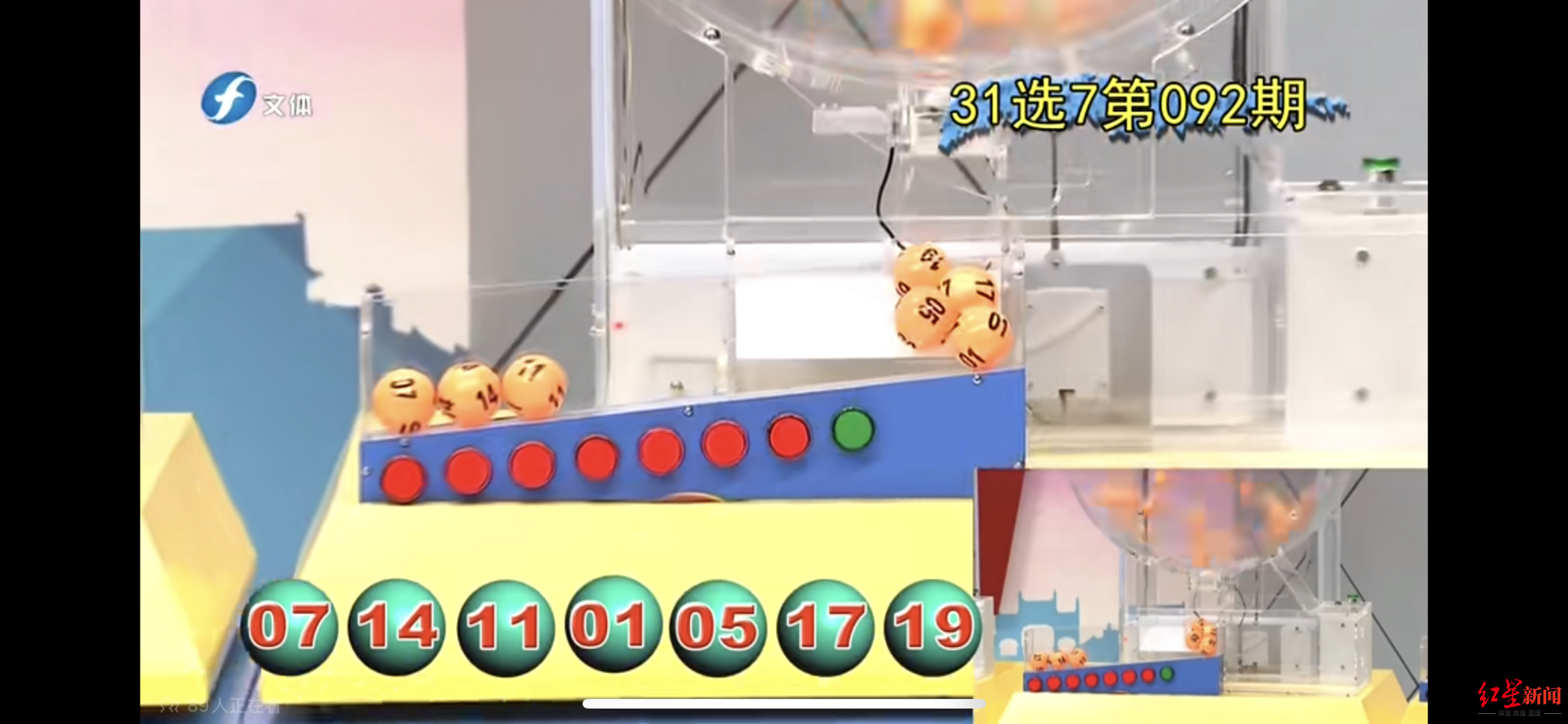 網傳視頻顯示,開獎視頻為福建31選7第92期。紅星新聞記者查詢福建省體彩官網,中獎彩球順序與中國體育彩票福建31選7第23092期開獎公告吻合,于今年4月12日開獎,一等獎無人中獎,二等獎有兩注中獎。根據該官網介紹,一等獎要求選中7個正選號碼。