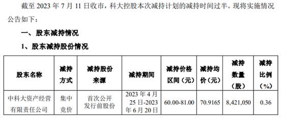 7月12日,科大訊飛發布的《關于股東減持股份實施情況的公告》顯示,股東中科大資產經營有限責任公司(下稱“科大控股”)在2023年4月25日-2023年6月20日減持8421050只股。同時表示,為落實《國務院辦公廳關于高等學校所屬企業體制改革的指導意見》及《教育部、財政部關于全面推開中央高校所屬企業體制改革工作的通知》的要求,科大控股原計劃在減持預披露公告之日(2023年3月22日)起十五個交易日后的六個月內以大宗交易或集中競價的方式減持本公司股份不超過23230843股。