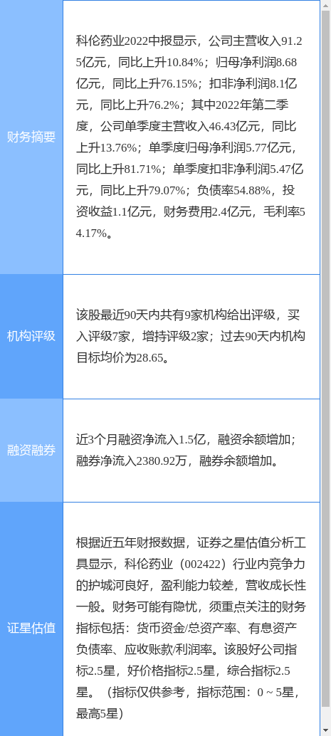 今日科倫藥業(002422)漲8.89%,收盤報24.61元。