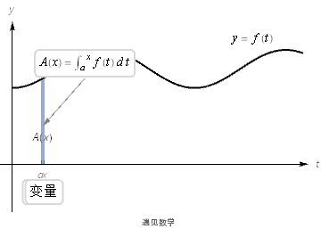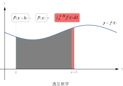 當積分的上限為x,在此基礎上,做自變量x和面積函數的微分,自變量x增加一個極小值h(dt):