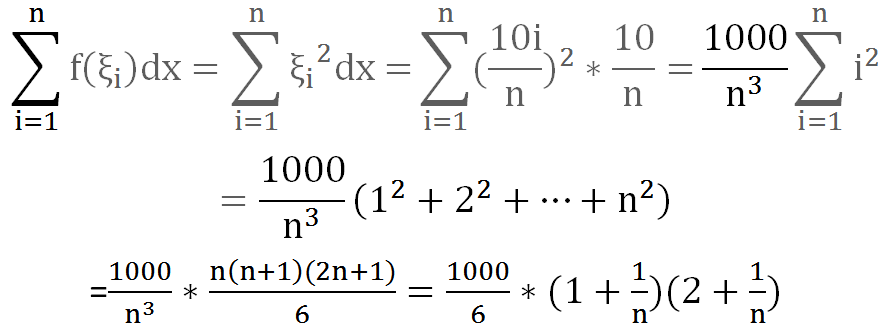 x2的反導數為1/3x3,所以上述所需求出的面積為:F(10)-F(0)=1000/3。