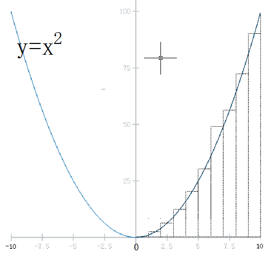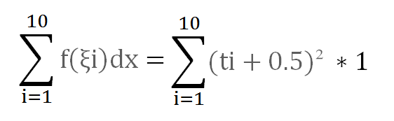 如果將區間[0,10]分成10個小區間,每個小區間的長度dx為1,在每個小區間[ti,tj]取點ξi(等于ti+0.5),每個dy=(ti+0.5)2,則將整個面積劃分為10個長方形: