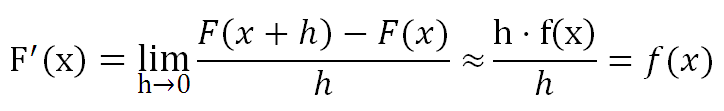 表達式h·f(x)就是面積函數F(x)的微分,函數的微分/自變量的微分稱為微商,也稱為導函數或導數,用F‘(x)表示。導數的形式在一定情形比微分的形式更簡潔,微分也可以由導數迂回求得,如上式可有如下推導: