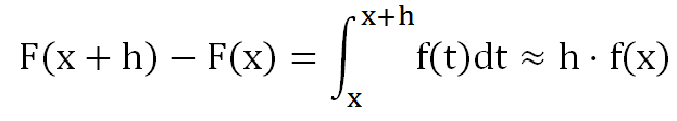 上圖淡紅色的陰影部分, 當 h 很小的時候幾乎為小豎條, 所以可以用計算長方形面積的方法來估算該豎條的面積, 它的底從x 到x+h, 高從0 到f(x), 所以面積是 h*f(t) , 也就是: