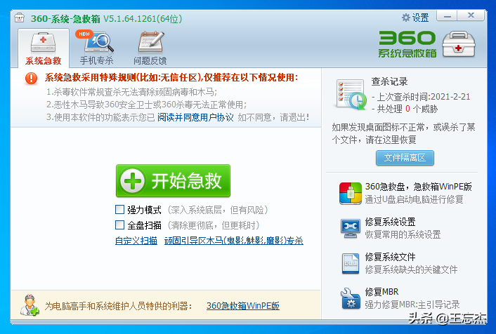 360系統急救箱可以說是我用過的360系列軟件中最強的存在,多次從病毒木馬和流氓軟件手里拯救電腦,360急救箱可以在安全軟件無法啟動,甚至exe都無法執行的情況下啟動。