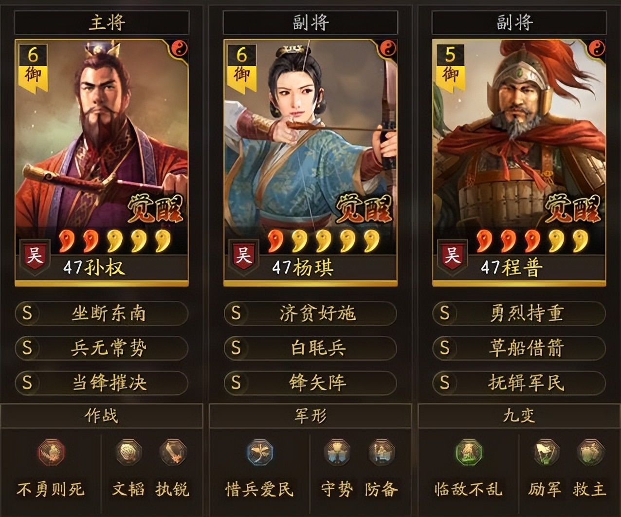 (3)孫權吳槍:孫權+魯肅+程普。孫權作為三戰財富和歐氣的象征,完全可以平替陸遜到吳槍陣容之中,戰法搭配和第二套陣容里一毛一樣,就不再贅言。唯一的不同點就是孫權文武比較均衡,其自帶戰法坐斷東南,有隨機獲得連擊、免疫、先攻、必中、破陣的效果,配合當鋒、兵無能打出爆炸傷害。下圖是云起劇本用自定武將拜師魯肅,可以吃到兵種紅利,效果要更好一些,基本構成原理是一致的。