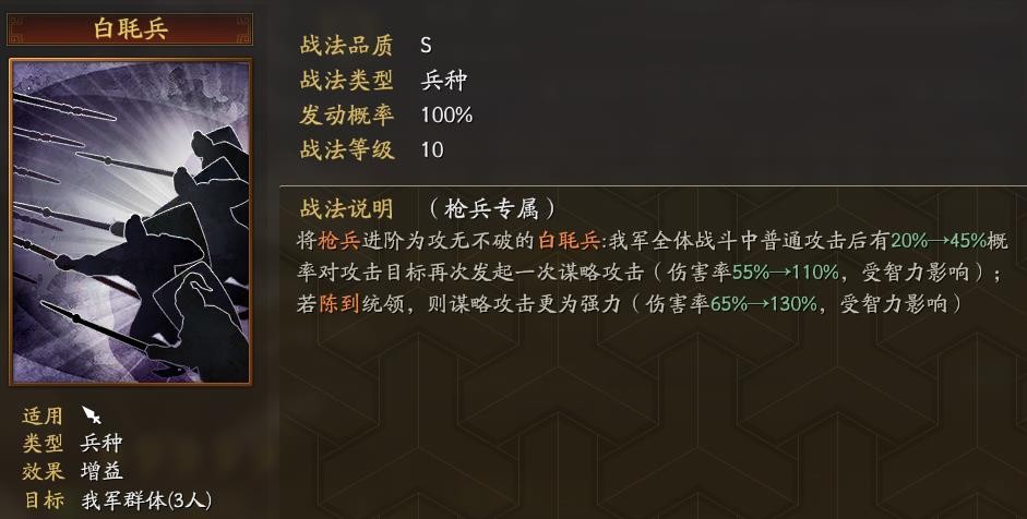 白毦兵作為特色兵種之一,既是陳到的自帶戰法,也是其傳承戰法。戰斗機理就是在全體普攻后有45%的機率發起謀略輸出,傷害率110%起步,受攜帶者智力影響。如果是陳到自己統領,則輸出殺傷力更強,會在原有的基礎上增加20%。很明顯,白毦兵非常適合文武雙全的武將攜帶,比如姜維、呂蒙、劉備、孫權等。由于白毦兵的觸發條件依賴于普攻,故此高頻次的普攻+法系傷害就成為白毦兵陣容里最具特色的那一環,像S1賽季組建天槍陣容和PK賽季的吳槍均為受益者。