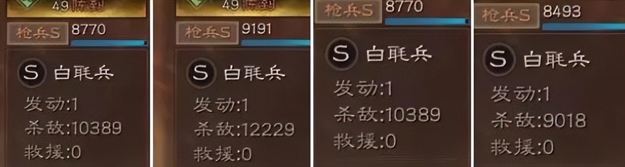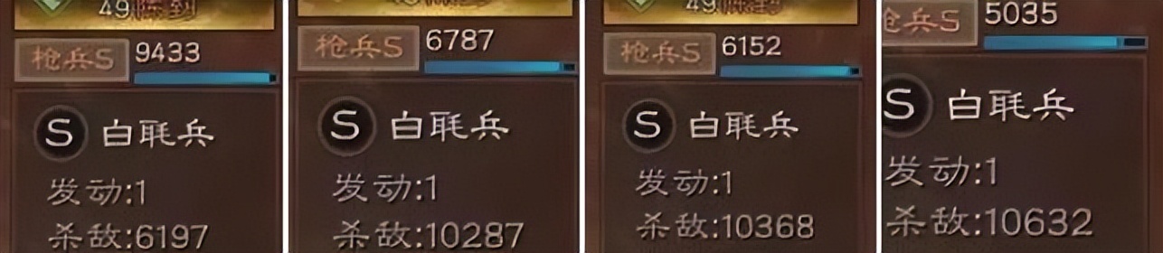 從出場率上分析,白毦兵在三大特種槍兵里的位置其實是居中的,不如青州兵的反擊傷害和回血治療,但是比起大戟士來還是強不少。特別是在今年經過了一輪平衡性調整,觸發概率由之前的40%提高到了45%,可能有人會說5個點的提升起不到什么大作用,實則不然,感覺戰斗力比之前高了一大截,攜帶者時常打出大幾千甚至上萬的傷害,有圖為證。