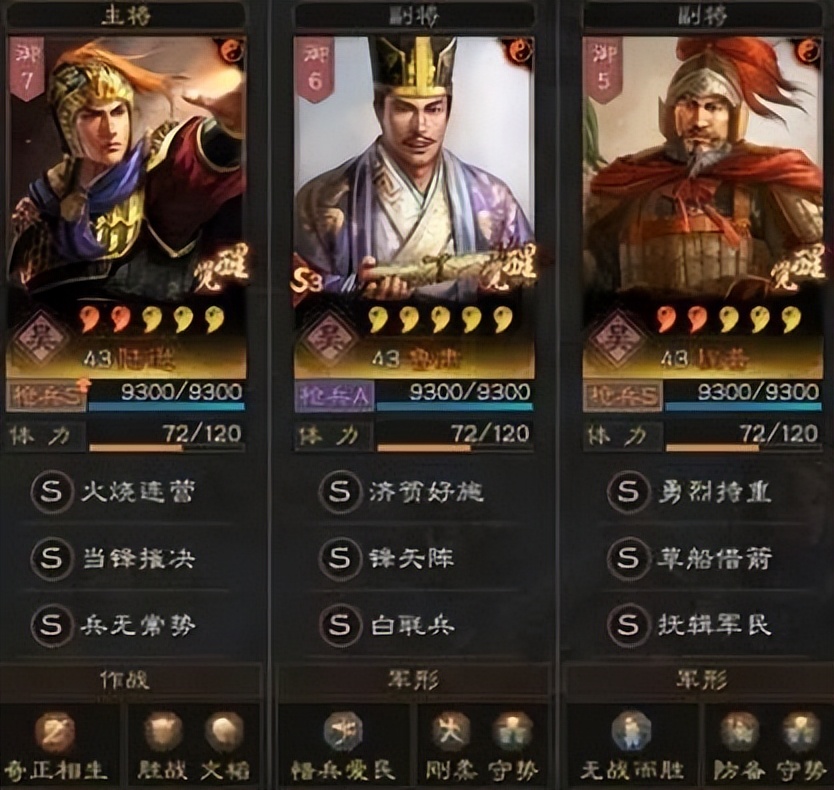 (2)陸遜吳槍:陸遜+魯肅+程普。大約從S6賽季開始,吳槍這個陣容就是少不了的話題,強勢多穿是它的最大特點,一度躋身T0之列,這幾個賽季強度似乎下降不少,但是在面對藤甲的時候,殺傷力依然勁爆、火火生威。陸遜其自帶戰法火燒連營具有穩定的輸出能力,外加震懾效果,搭配上當鋒摧決+兵無常勢,以及奇正相生的兵書,輸出、控場、回血樣樣不缺。魯肅為陸遜提供屬性加成和補足隊伍恢復能力和自身減傷能力,鋒矢陣雙增雙減,最主要的還是為陸遜輸出爆炸做鋪墊,白毦兵補一手輸出。程普鑒于較高統率值,帶上草船、軍民,提供高減傷高回復還有一手解控跟控制,成為了陣容里最靠譜的老人,保證了隊伍下限,也極大地提升了它的上限。