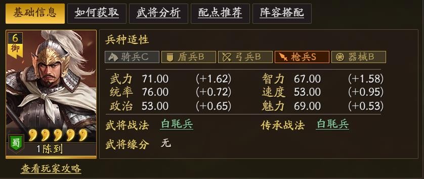 游戲對陳到的能力設定總體比較一般,兵種上只有槍兵S級,其余的3B1C根本擺不上臺面。四維屬性方面,武力初始值71、成長值1.62,看著還可以,普攻具有一定傷害,但對物理技能的期望值不高;統率初始值76、成長值0.72,非常低,不合格,這么脆容易被爆頭,這是一個致命弱點;智力初始值67、成長值1.58,還不如自己的武力值,勉強能用,算是低配版的智勇雙全模板;速度初始值53、成長值0.95,滿級后勉強過百,面對慢速隊伍時可能派上用場。