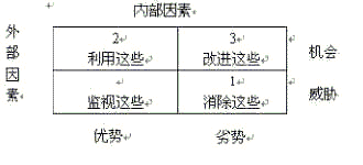 把識別出的所有優勢分成兩組,分的時候以兩個原則為基礎:它們是與行業中潛在的機會有關,還是與潛在的威脅有關。用同樣的辦法把所有的劣勢分成兩組,一組與機會有關,另一組與威脅有關。