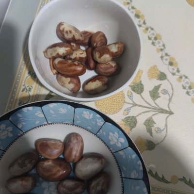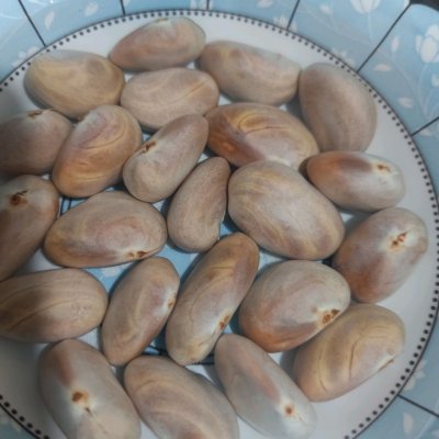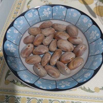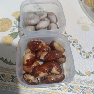 4、撈出放涼,可以留一些吃原味。把想要做甜口的核外面皮剝開(主要剝外面硬的發白的皮)