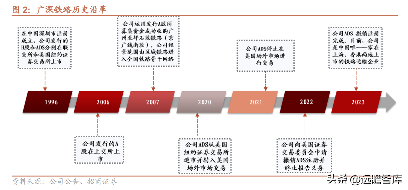 1996年,廣深鐵路股份有限公司作為中國鐵路第一家股份制企業正式掛牌成立,同年5月,公司發行的H股和ADS分別在香港聯交所和美國紐約證券交易所上市,籌集資金凈值42.1億元。
