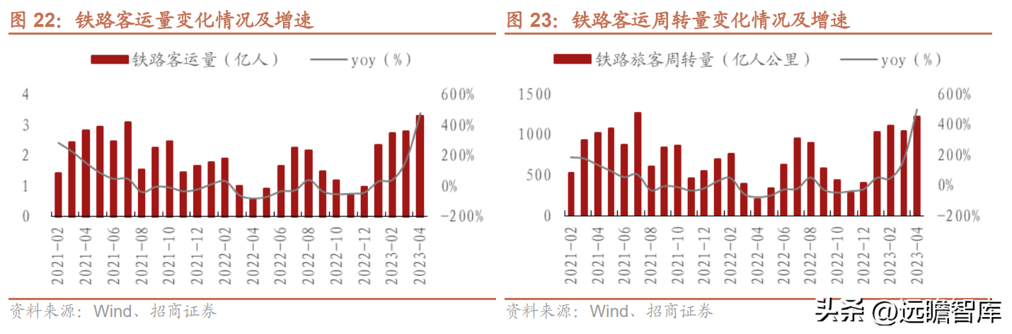 截至2023年4月,全國鐵路客運量達到3.3億人次,同比2022年增長478.1%,環比3月增長17.3%,較2019年同期增長7.7%,鐵路客流持續加速修復,4月客流已超過疫情前水平。