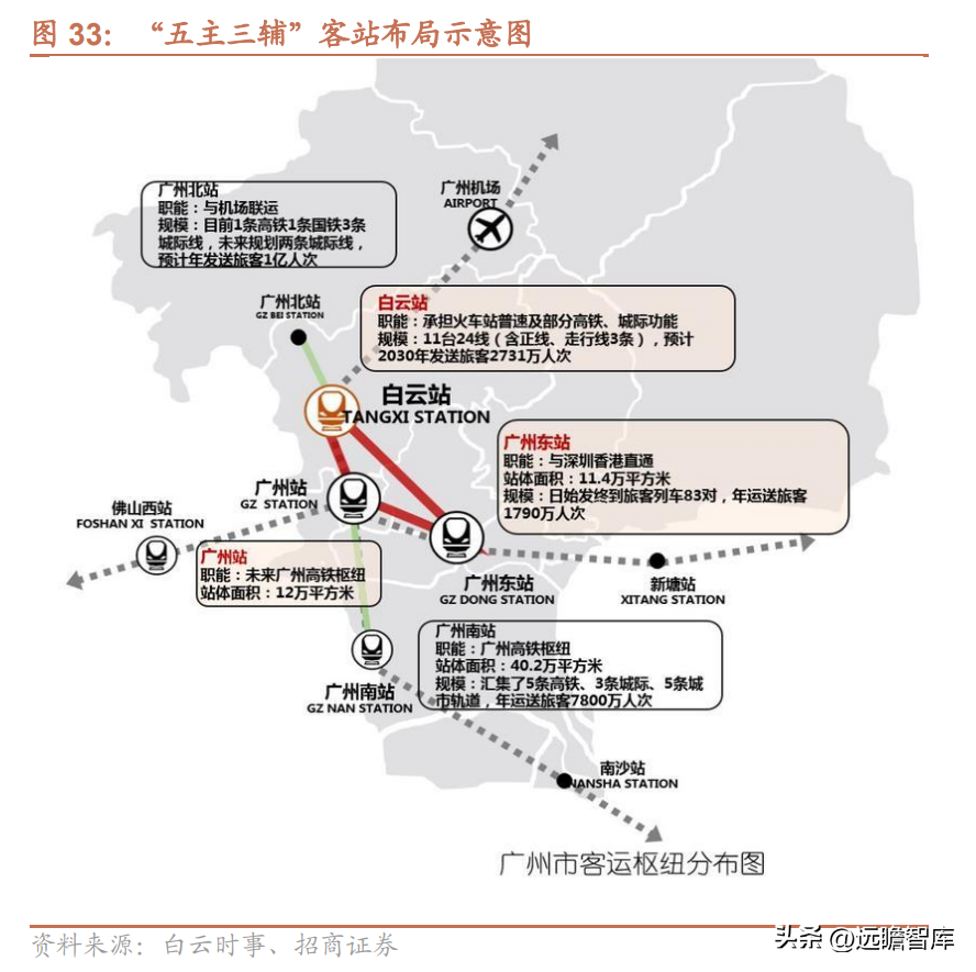 而廣州東站核心職能為與深圳、香港直通,廣州站核心職能為未來廣州高鐵樞紐,未來通過建成白云站并升級廣州站、廣州東站,廣州將形成“三站一體”緊密聯動的中心城區組合樞紐,中心區鐵路樞紐服務能力大幅提升,加速推動高鐵進城,預計白云站建成后將承接廣州站及廣州東站的普速列車,因此白云站改擴建完成是后續兩大站點改擴建的基礎。