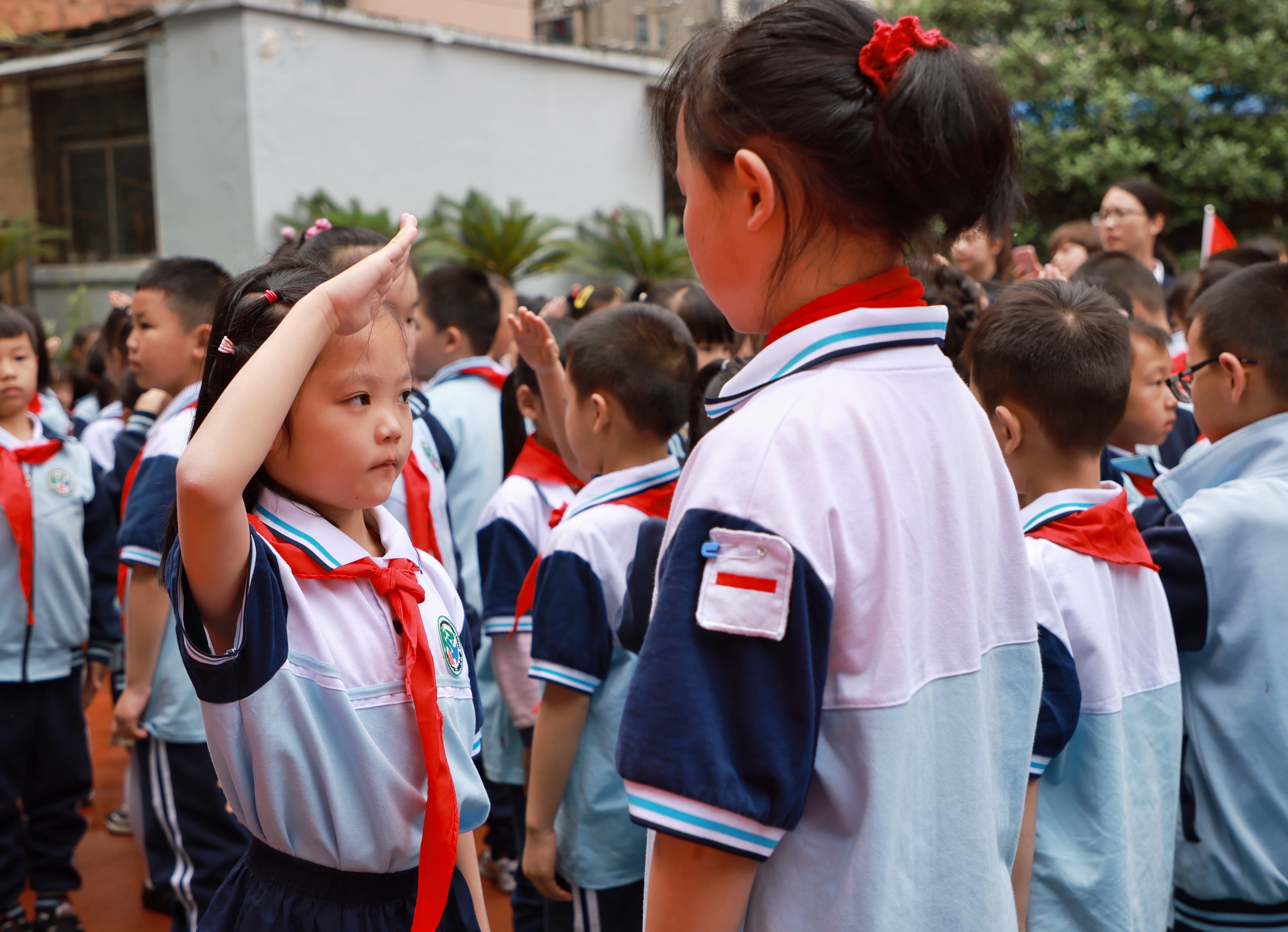 5月31日,新入隊的少先隊員在入隊儀式上向高年級少先隊員敬禮。 新華社記者 劉續 攝