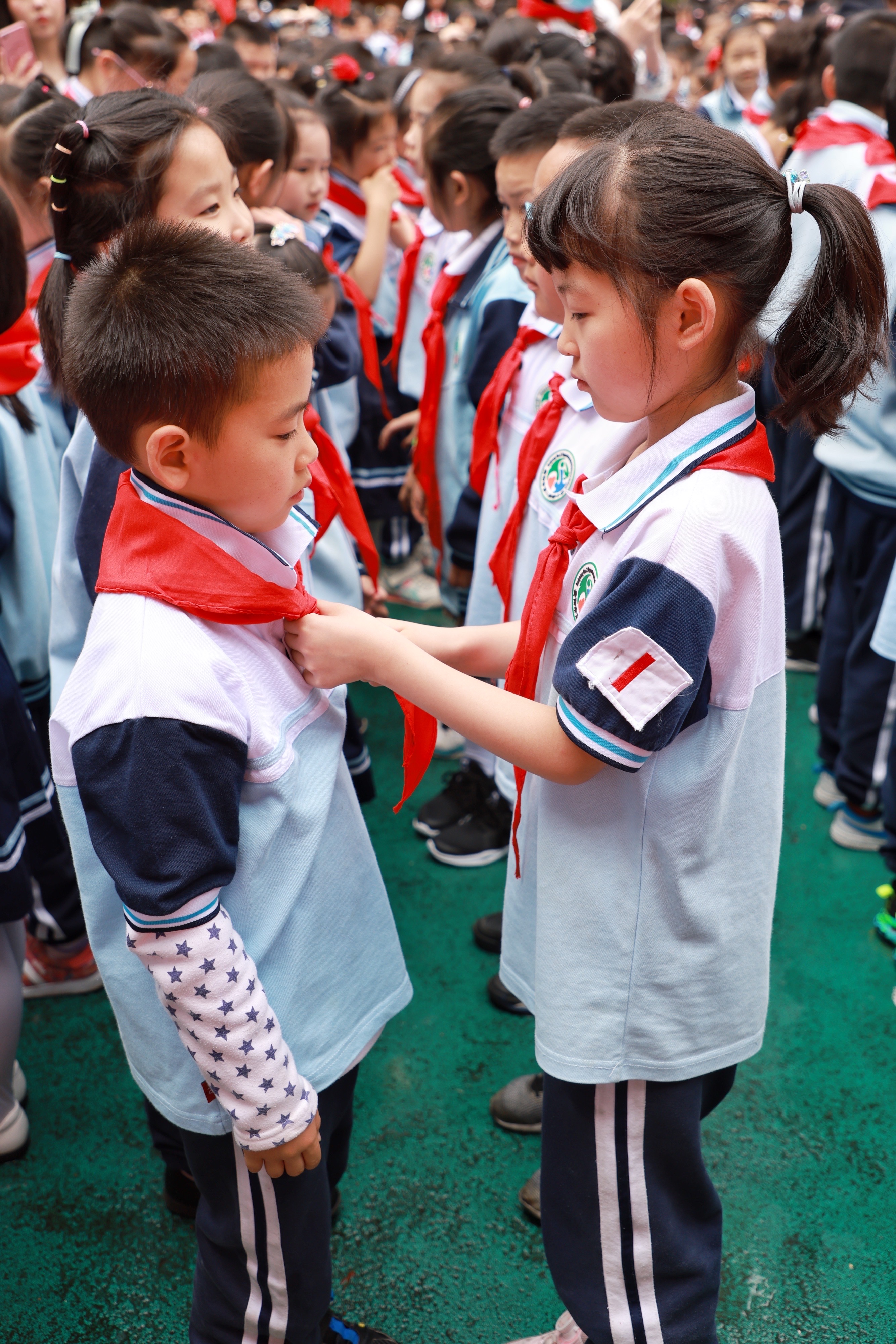 5月31日,高年級的少先隊員在入隊儀式上為新入隊的同學系紅領巾。 新華社記者 劉續 攝
