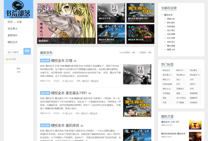 網站具有很多精校版小說,我們可在左側通過“知名-作者”或者輸入關鍵詞進行搜索,也可以根據小說的標簽、分類在右側查找。