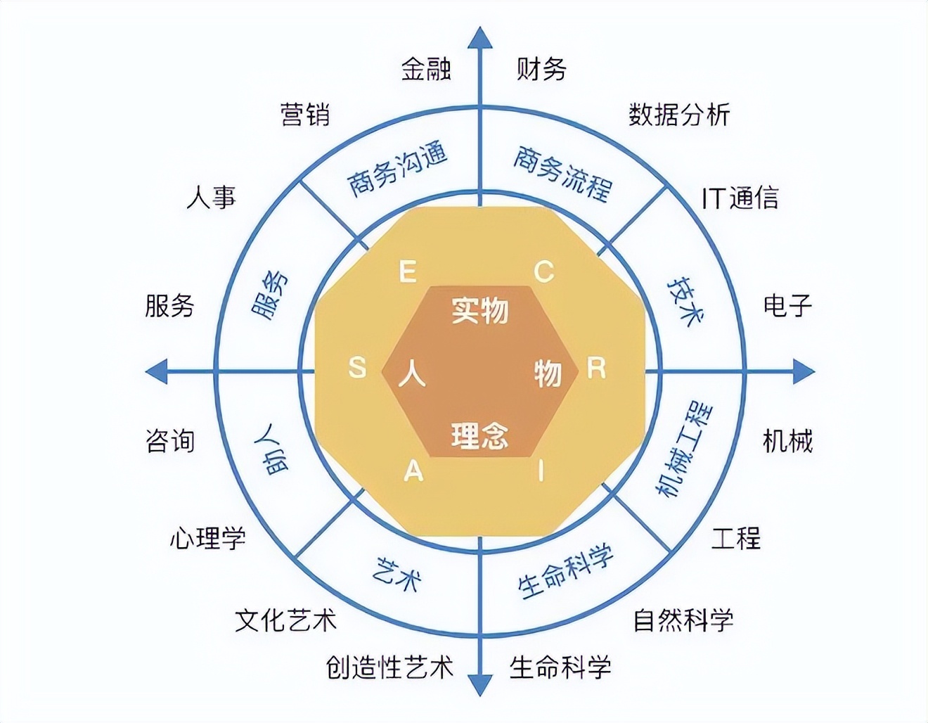 根據興趣的不同,人格可分為研究型(I)、藝術型(A)、社會型(S)、企業型(E)、傳統型(C)、現實型(R)六個維度,每個人的性格都是這六個維度的不同程度組合。