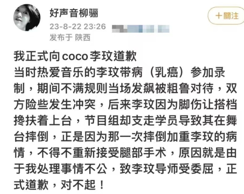 而始作俑者也終于得到了報應,除了好聲音母公司股價大跳水外,好聲音導演柳驪也疑似向李玟公開道歉。