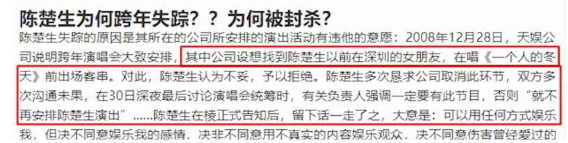 既然公司不顧他的強烈反對,陳楚生便醞釀了一個計劃,那就是直接在跨年演唱會上走人,因此造成了湖南臺跨年演唱會史上最嚴重的翻車事故。