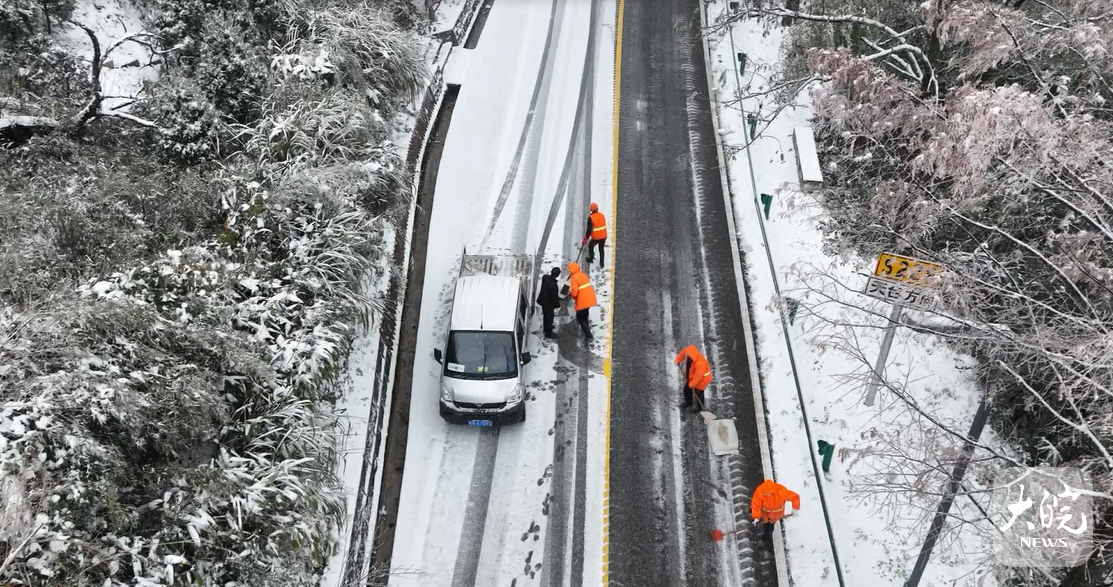 降雪發生后,九華山風景區及時啟動應對雨雪天氣工作預案,交警部門全員上崗,根據路況適時進行交通管控。公路部門調運20噸融雪劑和5噸冷補材料,組織20多名道路工人對盤山公路和九閔公路潑灑融雪劑。2臺鏟車不間斷進行鏟雪除冰,全力保障道路通行安全。