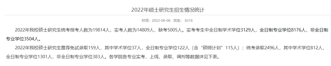 ? 2022年碩士研究生統考報考人數為19814人,實考人數為14809人,缺考5005人。實考考生中全日制學術學位3129人,全日制專業學位8176人,非全日制專業學位3504人。