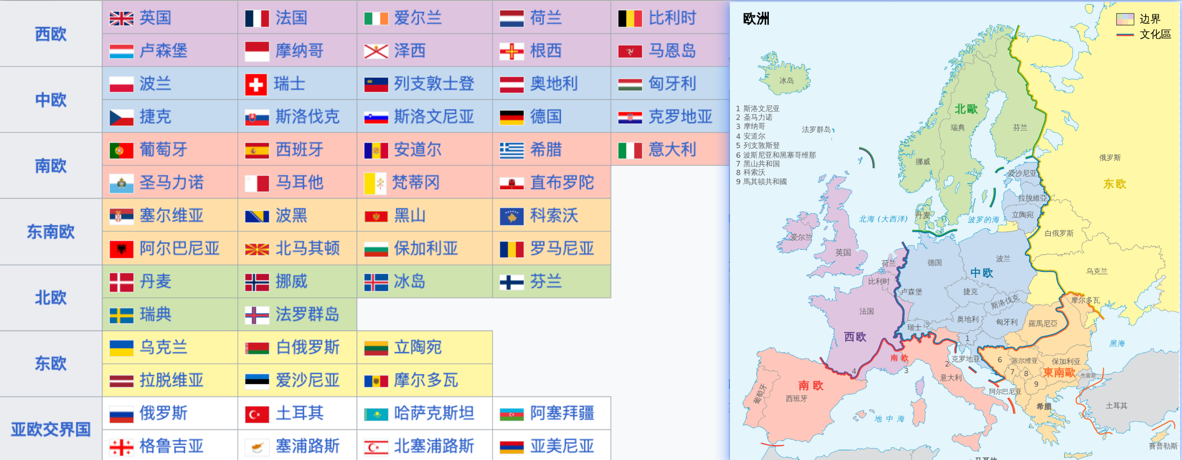 歐洲的地理區域按照主流可分為西歐、中歐、東歐、北歐和南歐、亞歐交界國地區。