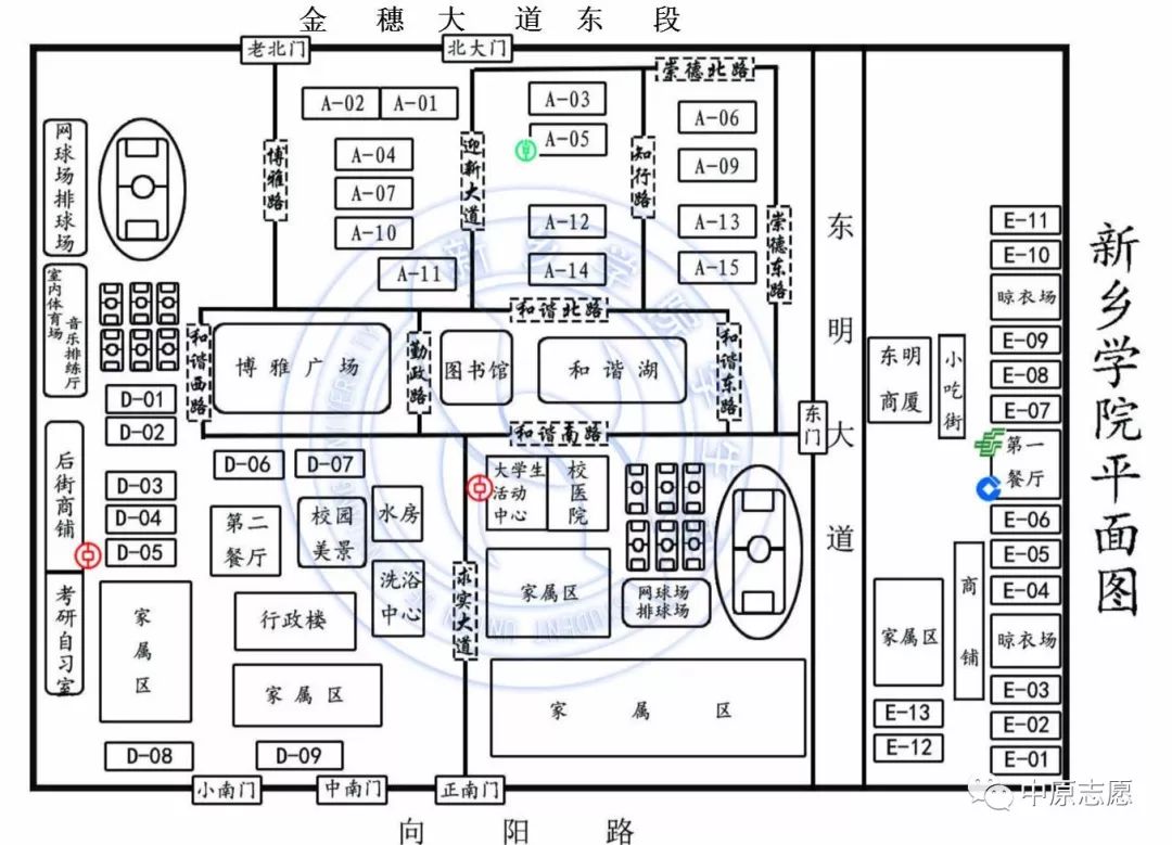 新鄉學院只有一個校區,在校區里又分了東區和西區,兩區僅隔著一條馬路,東區主要是宿舍樓和生活區,西區是主校區;新生的宿舍基本都是6人間,東區帶獨立衛生間,西區大多沒有,宿舍里有風扇、暖氣,每個樓層里有全自動洗衣機、熱水器。圖書館大樓正在建設中,目前圖書館館舍分散在四處教學樓內。