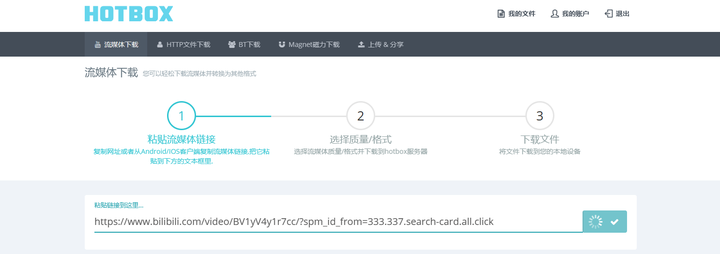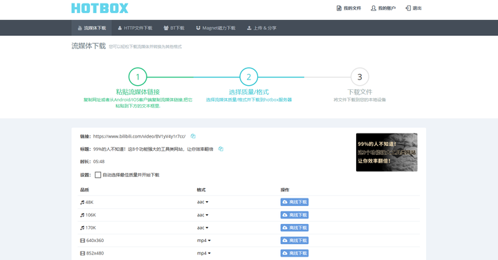 提前復制網頁播放的視頻鏈接,然后將鏈接粘貼到橫線上,它會自動對視頻文件進行解析,等待一會就可以看到解析成功的音頻文件和視頻文件,其中音頻文件還單獨解析出來兩種格式,根據自己的需求選擇下載。