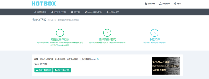 一個完全免費的視頻下載網站,支持下載各種網頁視頻,而且還能單獨解析出視頻里的音頻文件,只需要登錄賬號就可以進入下載頁面,三步就可以將視頻文件下載保存到本地。