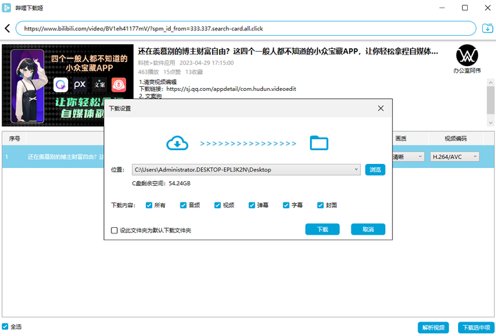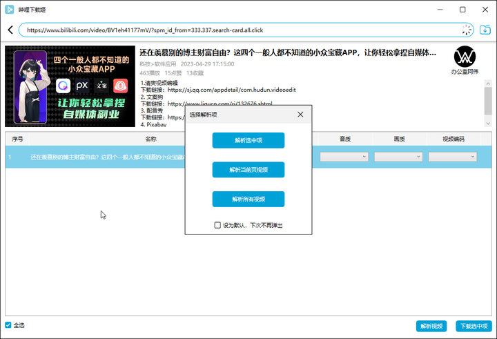 然后在頁面點擊下方的選中視頻解析,接著就可以看到解析成功的視頻文件,包括視頻上的彈幕、音頻文件都能一并解析出來,根據自己的需求選擇下載。