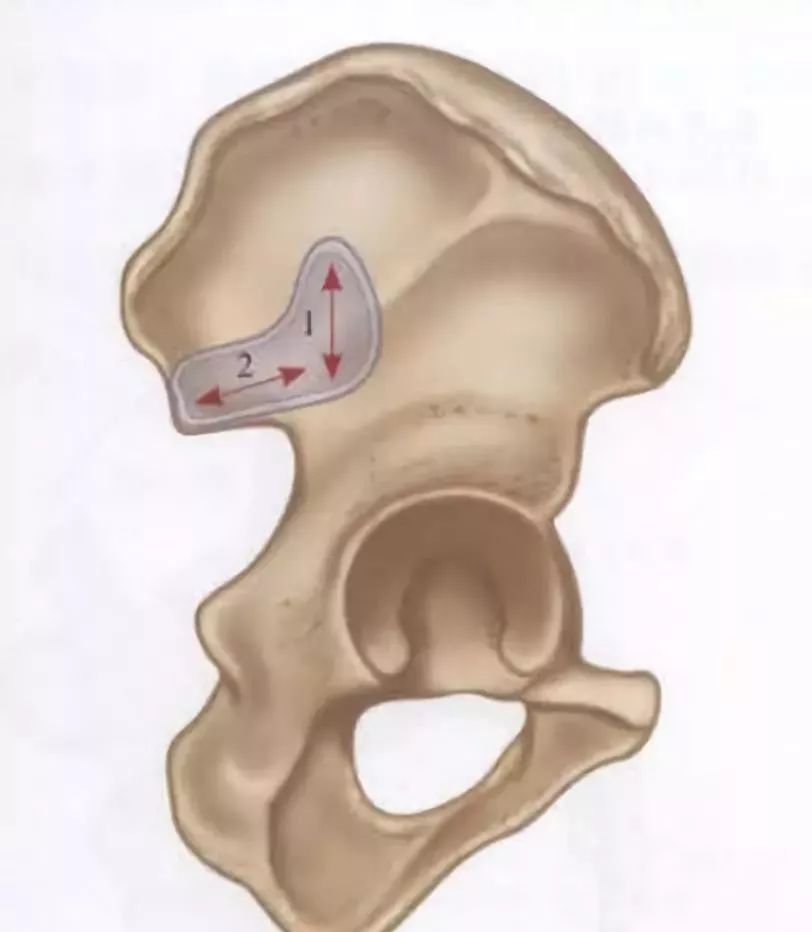 髂骨上 L形關節面的短臂(1.垂直向)和長臂(2.水平面)
