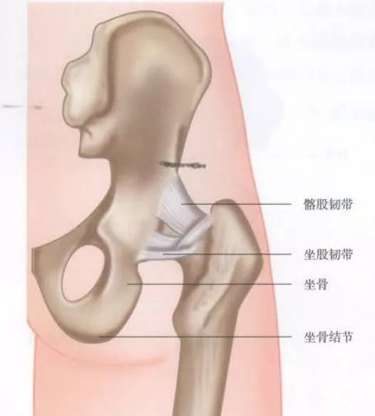 坐骨比髂骨窄,位于髂骨下方和恥骨后方。坐骨有一個非常容易觸及的部位,叫作“坐骨結節”,常被稱為“用來坐的骨頭”,是重要的骨性標志,繩肌就附著于此。坐骨是髖部三塊骨骼中最強壯的部分,將近2/5 的髖關節窩由坐骨構成。