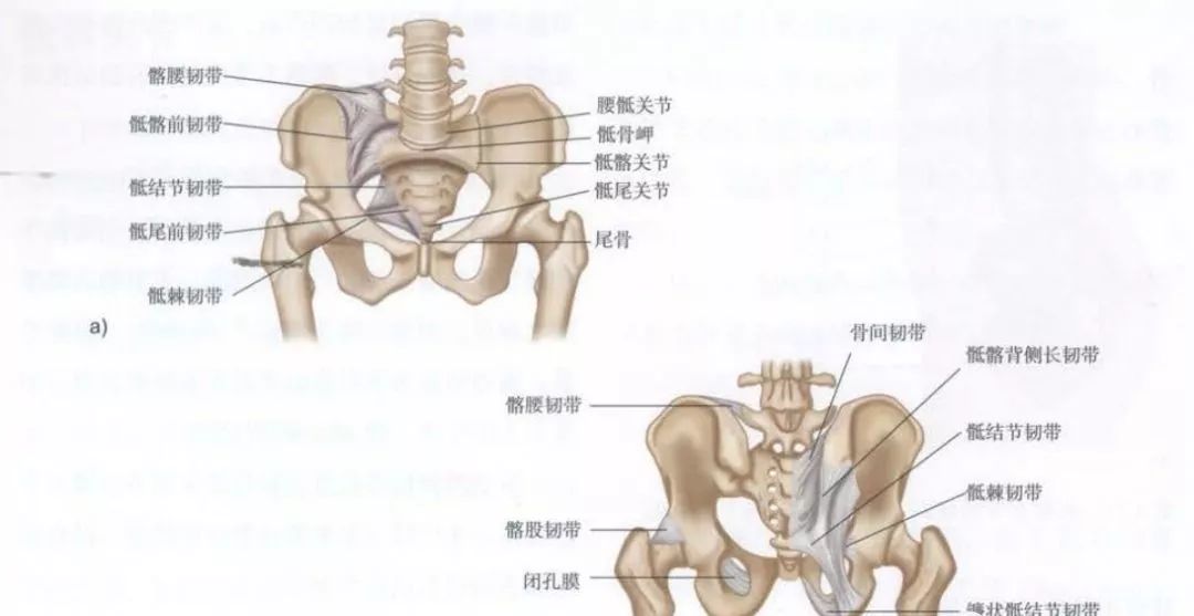 韌帶與骶髂關節的穩定性關系:a)前面觀,b)后面觀