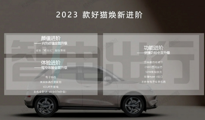 智電出行獲得了2023款歐拉好貓的疑似配置信息:新車搭載電子懷擋、米其林高性能輪胎、V2L對外放電、主機全新UI及方向盤4項調節等配置。經銷商銷售員表示,2023款歐拉好貓的官方指導價或上調7,000-10,000元,預計2月26日上市。