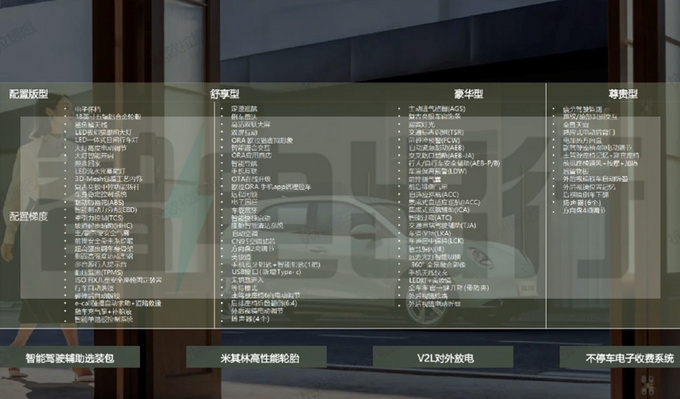 豪華型增加主動進氣格柵、前排側氣囊、360°全景影像、手機無線快充等;尊貴型增加全景天窗、感應式后尾門、方向盤加熱、前排座椅通風+按摩+加熱等。