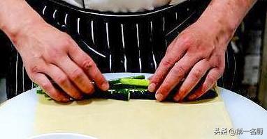 2.蒜片拍扁切碎放入碗中,大蔥白去掉內芯切成蔥末,黃瓜從中間切開,分成四瓣去掉內瓤,將豆腐皮伸平,把香蔥和黃瓜條一起卷入豆腐皮中。