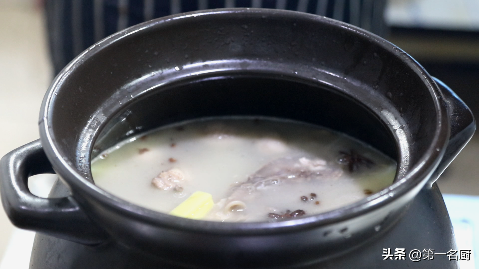 6.起鍋添入適量的清水,加入少許料酒去腥,等水燒開后,下入蔥姜和大料,再下入鴨肉,加入食鹽3克,等水再次煮沸以后,倒入小鍋里面,開中小火慢慢燉煮25分鐘。