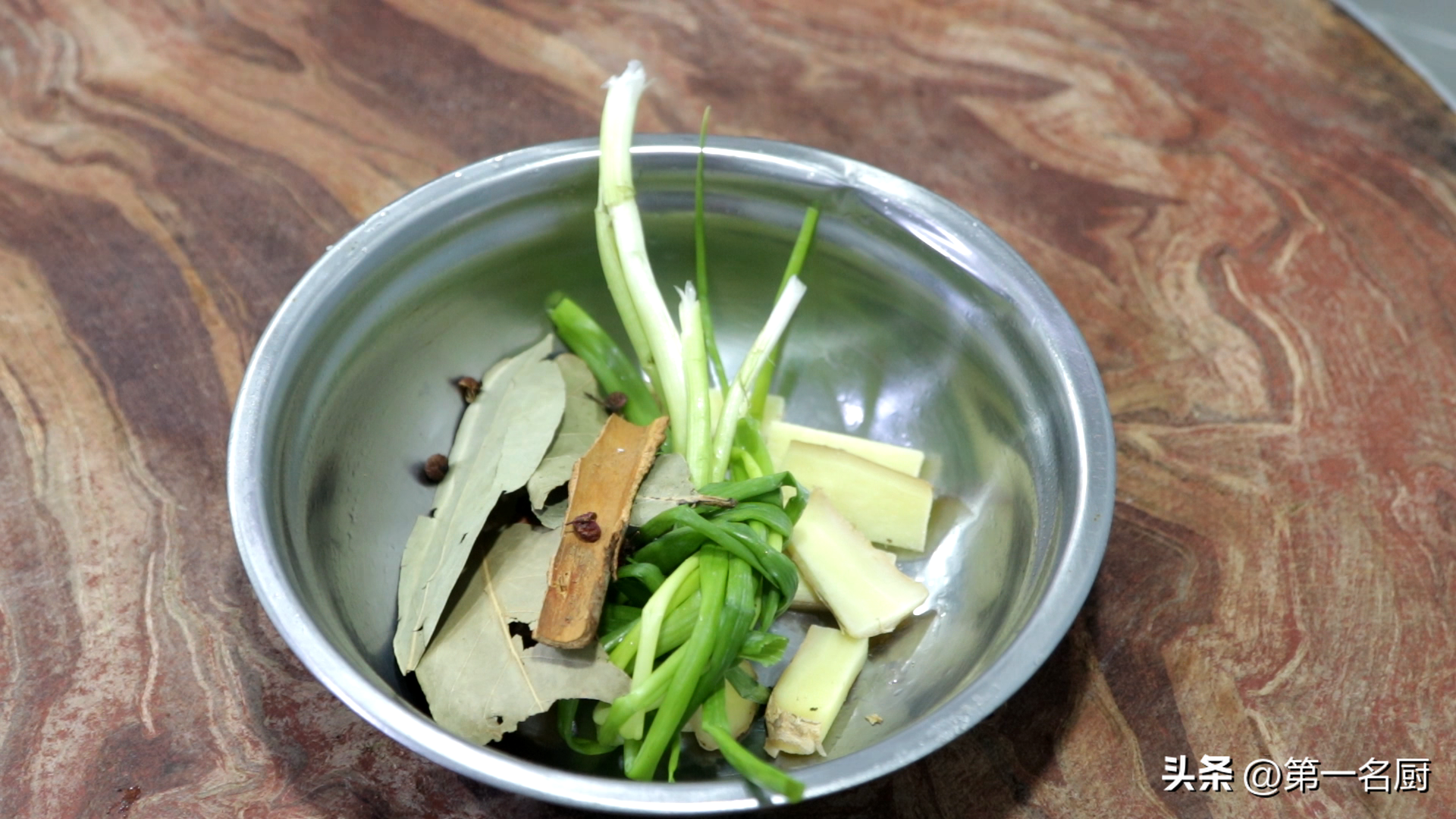4.生姜一塊切成姜片,放入盆中,再放入一個小蔥結,3粒八角,幾片香葉,一小塊桂皮,幾粒花椒備用。