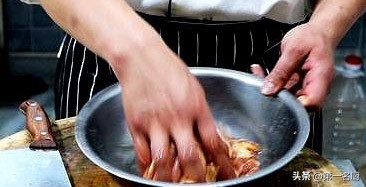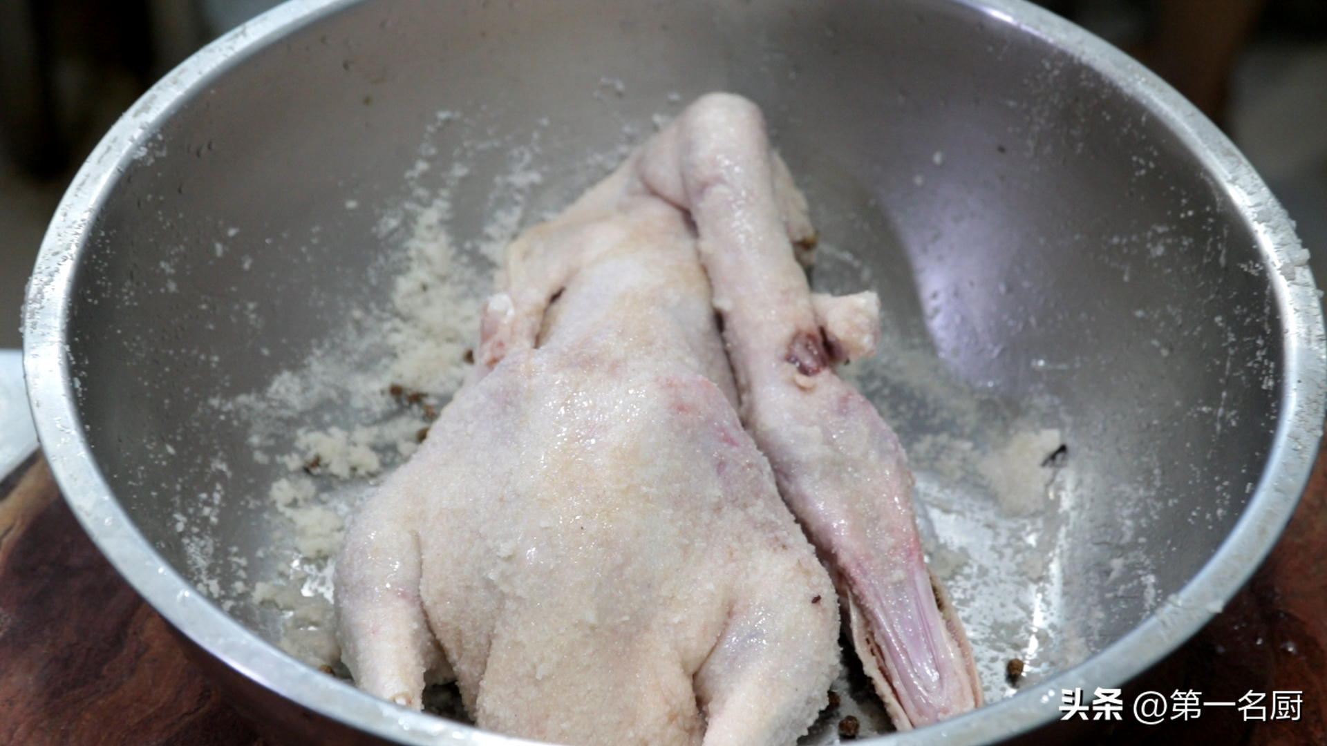 3.20分鐘過后,把鴨肉里面再重新清洗一遍,放入盆中,倒入炒好的食鹽和大料,再把食鹽均勻地涂抹在鴨肉上面,放在一邊腌制一個小時,使其慢慢入味。