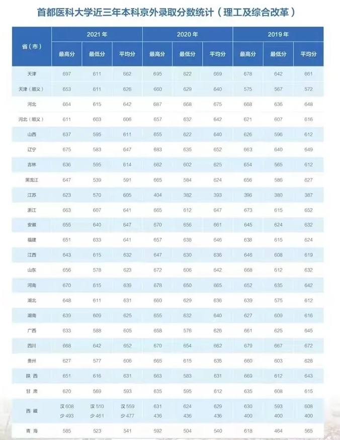 當然,首都醫科大學的錄取分數線也是相當高的。近三年來在大部分省份的錄取分數線都在六百二三十分,超越了不少985重點大學。