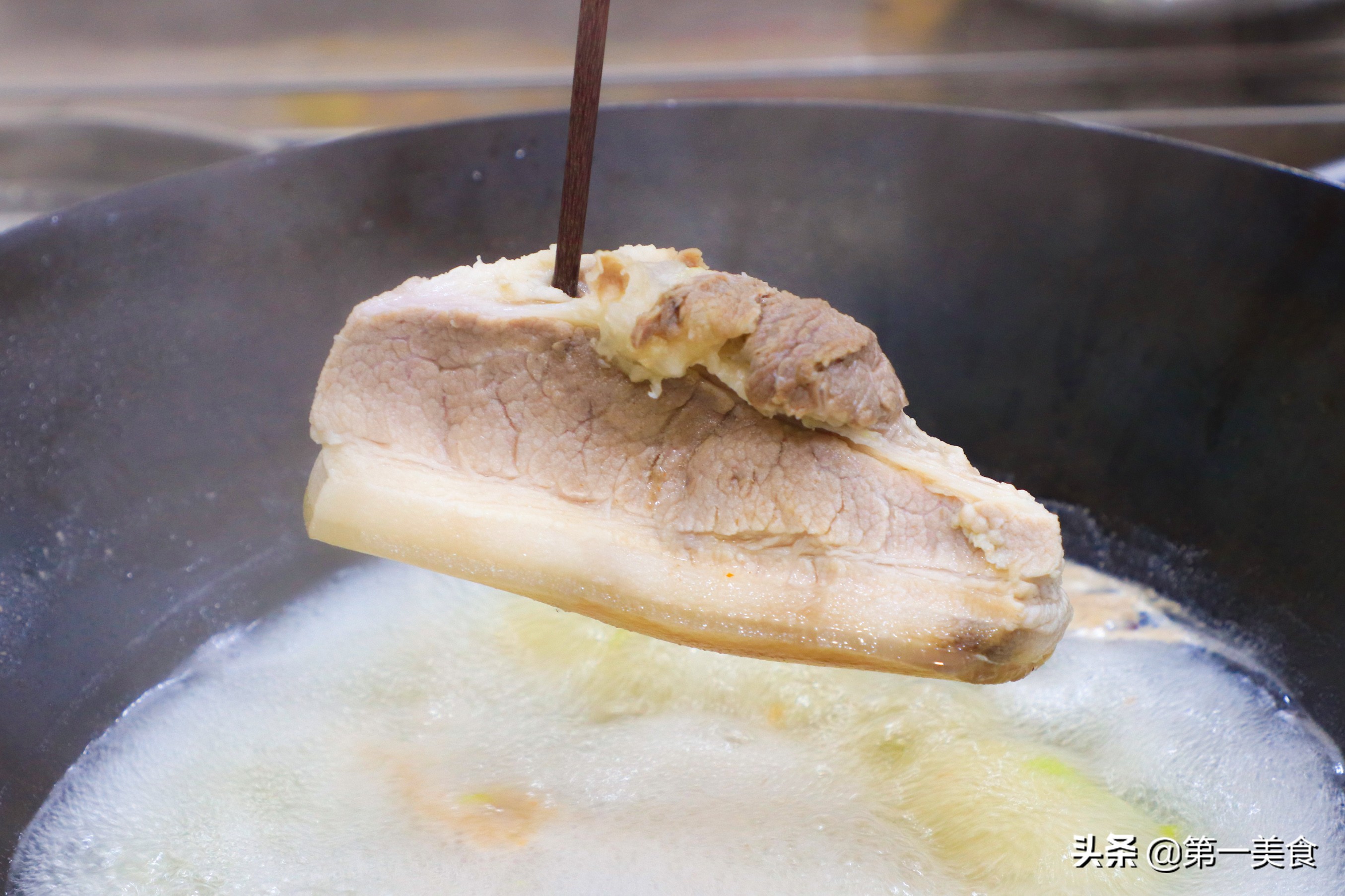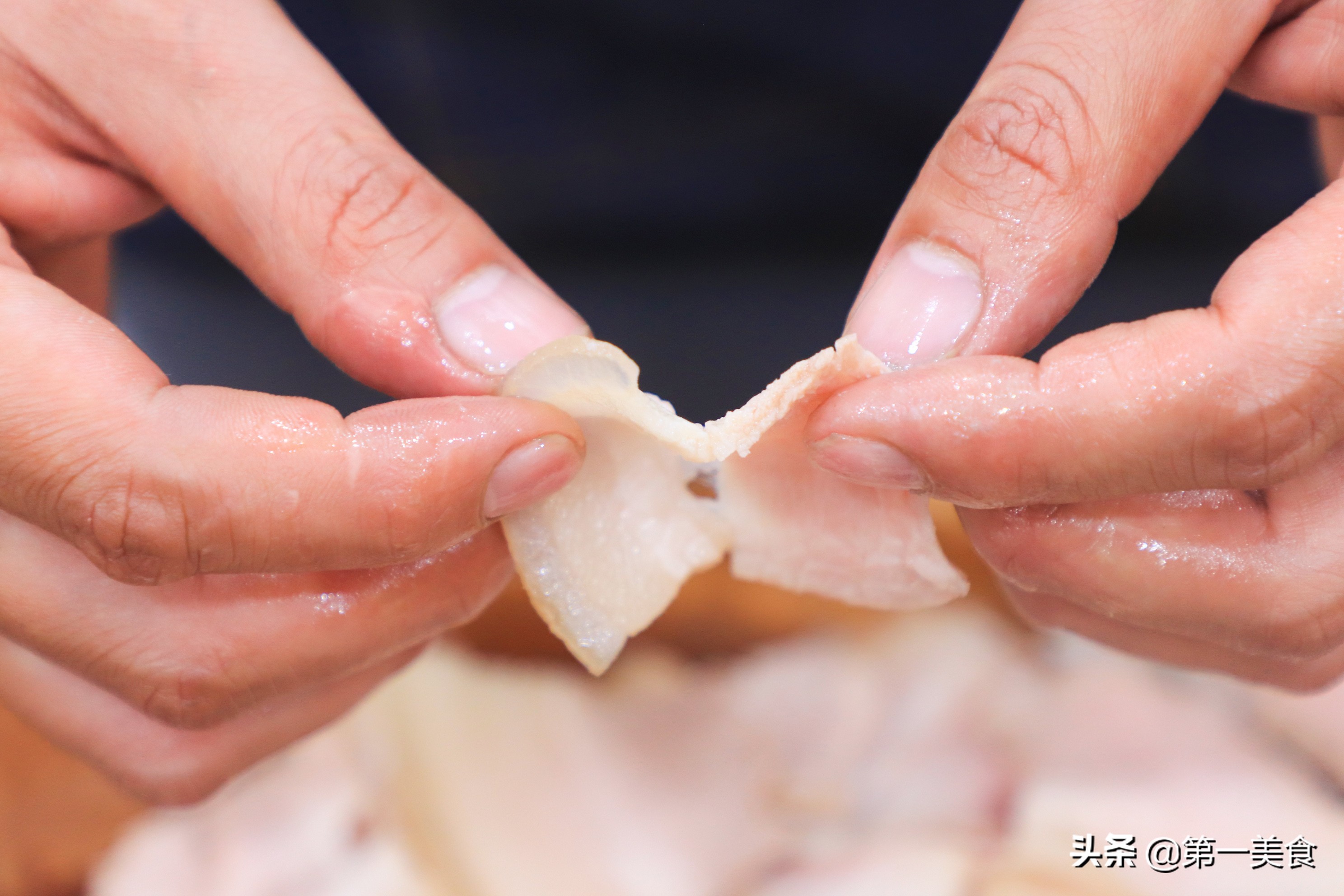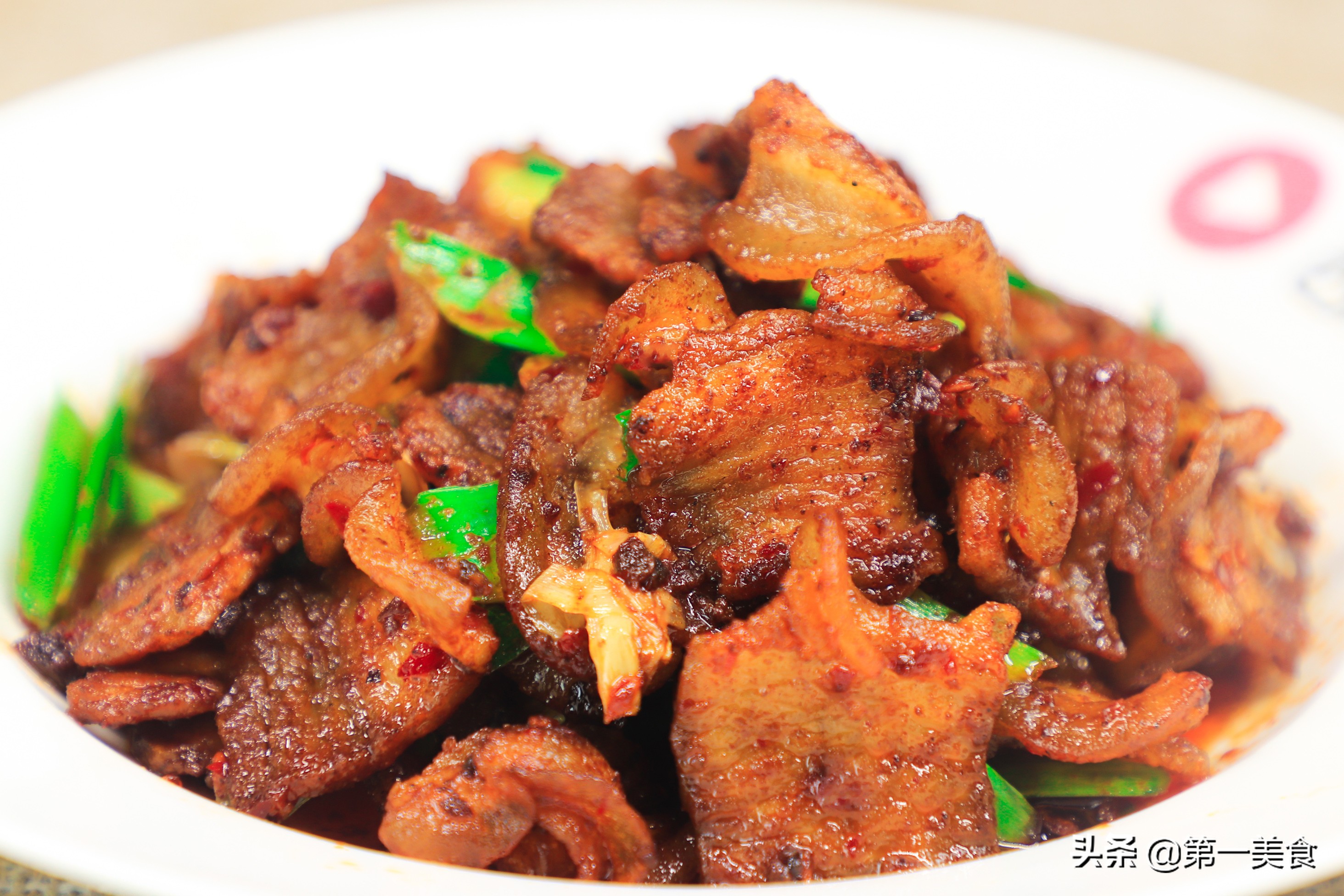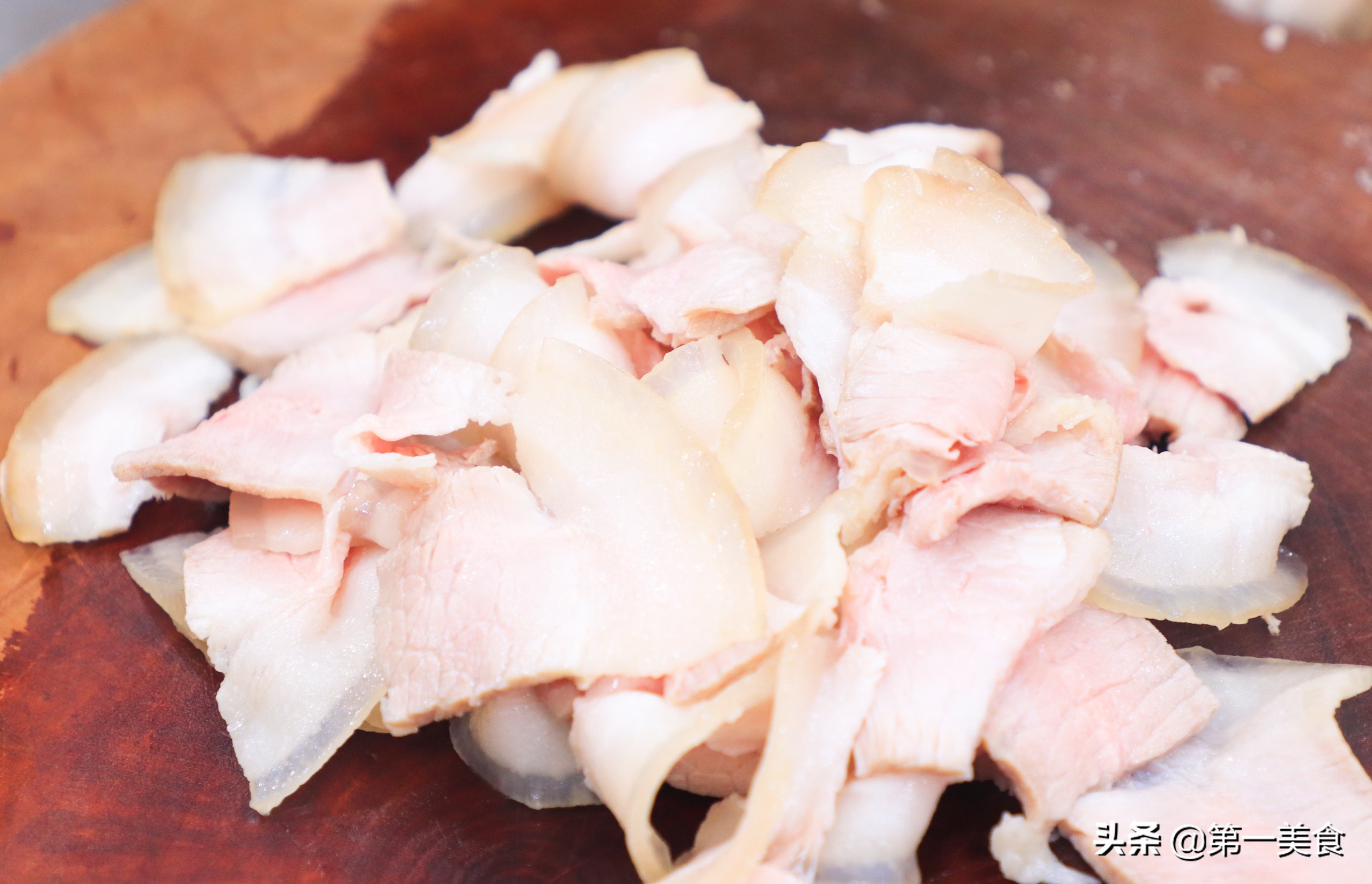 1.首先選材方面很講究,后腿坐墩肉的二刀肉為首選,但是,我們一般在超市很難能買到這種豬肉,只能用一些五花肉替代,二刀肉很容易形成打卷的燈盞窩。
