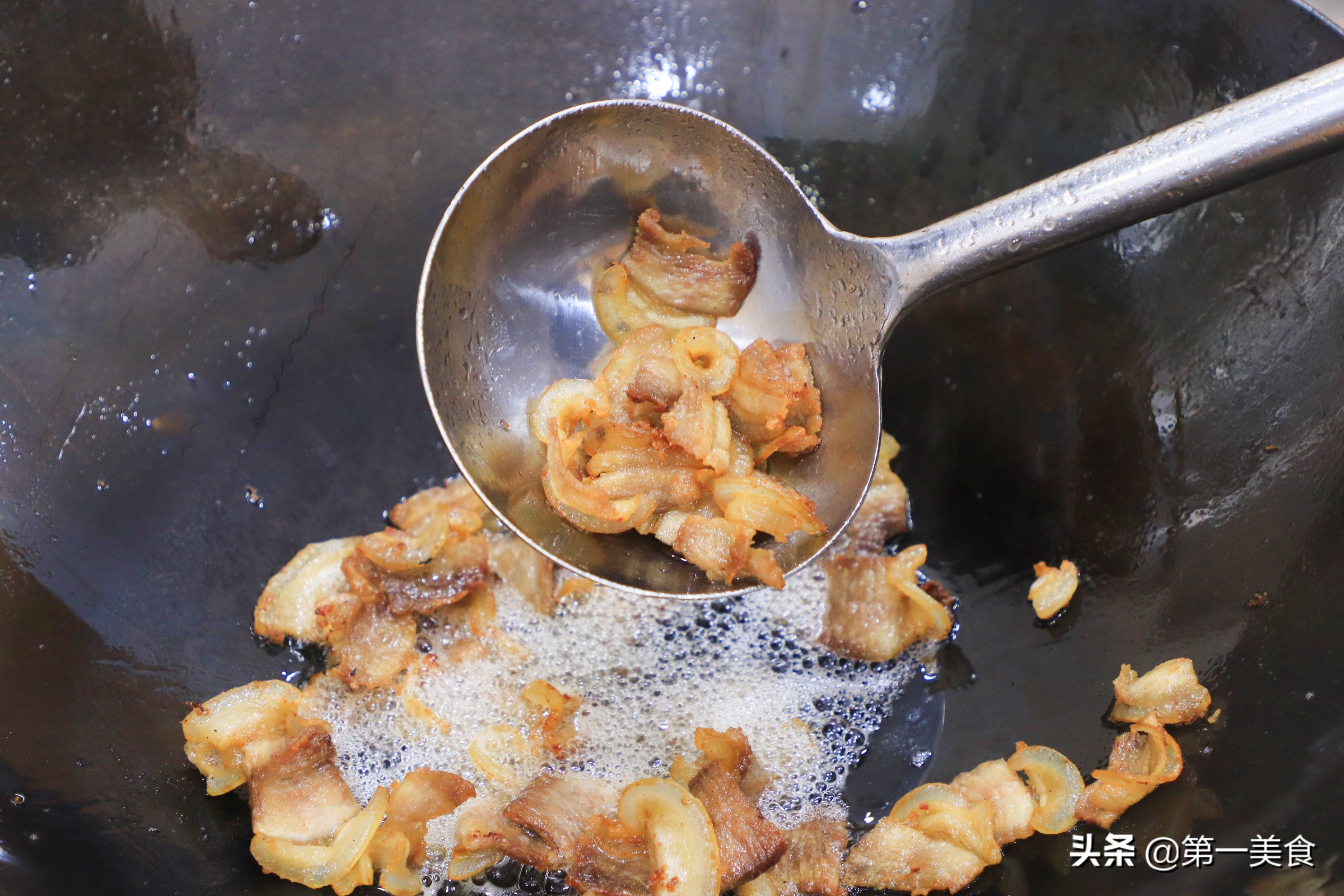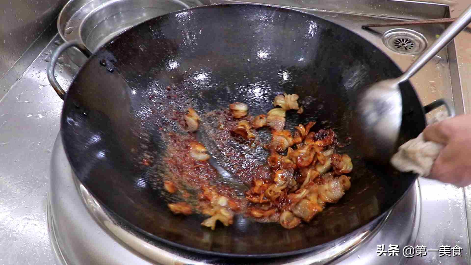 8.下面我們就可以烹炒了,把鍋燒熱加植物油滑鍋 滑好鍋以后,留少許底油,倒入肉片不停的翻炒讓其均勻受熱,煸炒過程中肉片會逐漸吐出油脂,慢慢卷起來,把肥肉炒成半透明肉片呈凹狀時盛出來。