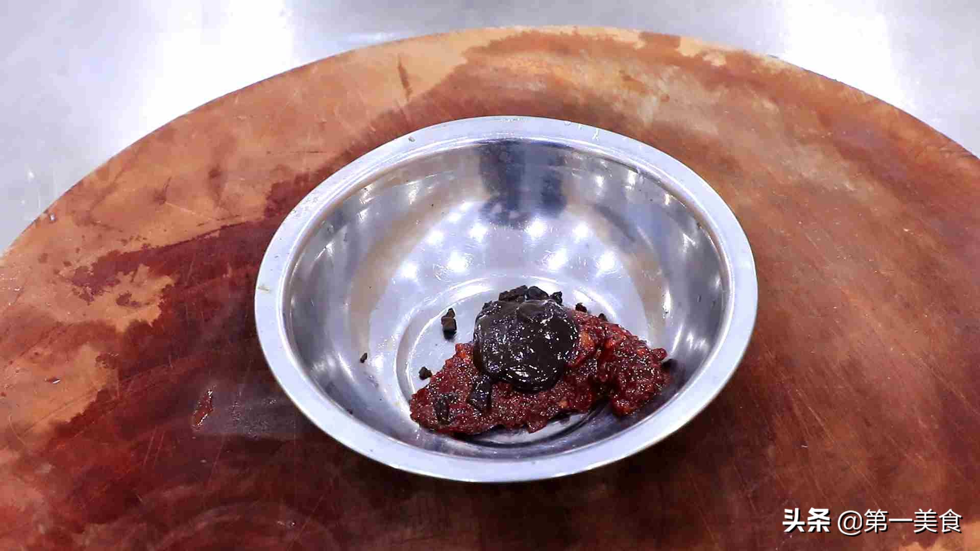 7.豆豉幾粒用刀背壓碎方便出香,郫縣豆瓣我們把它剁得細一些,以免過大的辣椒片影響賣相,最后放一勺甜面醬平衡口味,增加回甜的口感。