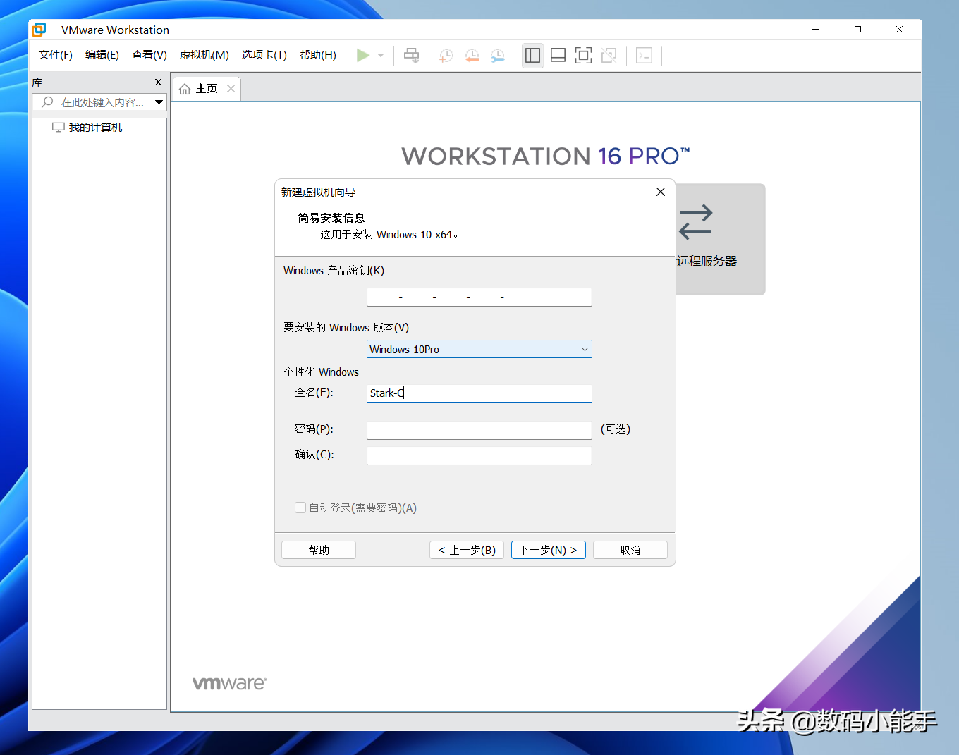 這步里面的產品密鑰可以暫時不填,windows版本就是我們常說的教育版,家庭版或者專業版。我途中選擇的是專業版。全名隨便填一個,密碼也可以不填。然后接著點擊“下一步”。