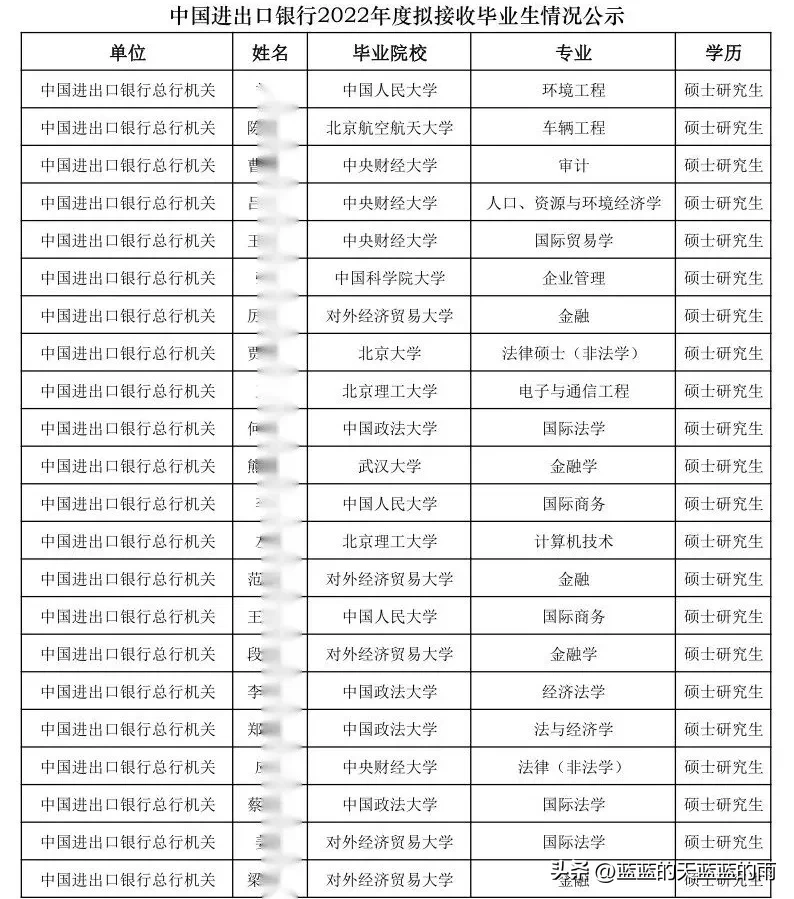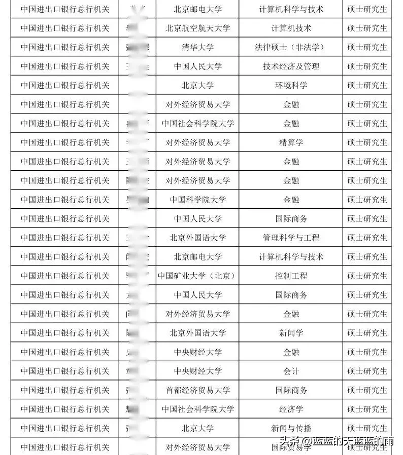 下列名單顯示,中國進出口銀行錄用畢業生的門檻較高,全部是名校碩士研究生,中央財經大學錄用人數達12人,清華、北大、人大、貿大等高校錄用人數多少?寶子們快來看看吧~