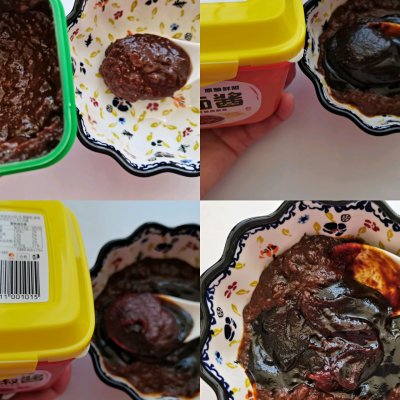 3、另外準備一只小碗,碗中加入3勺豆瓣醬、2勺甜面醬、1勺辣椒醬,攪拌均勻備用。