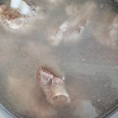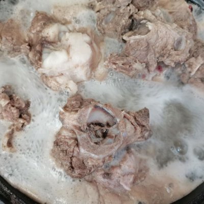 4、泡好的大骨頭冷水下鍋,鍋開撇去浮沫,多翻動幾次,熬煮10分鐘,盡量撇盡血沫。