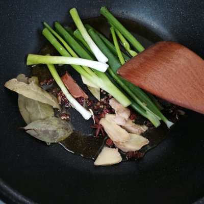 8、將熬過糖色的鍋清洗干凈,鍋中倒油,放入調料炸出香味。